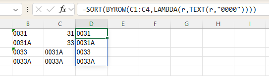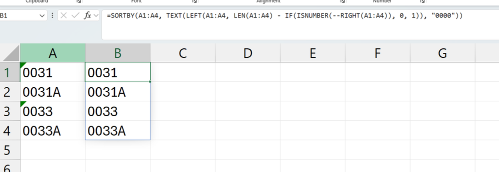 =SORTBY(A1:A4, TEXT(LEFT(A1:A4, LEN(A1:A4) - IF(ISNUMBER(--RIGHT(A1:A4)), 0, 1)), "0000"))This makes sure the numbers 0031 and 0033 are sorted first, and then their letter variations (like 0031A and 0033A) appear right after them.