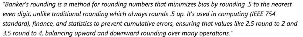 I'd never heard of "Banker's Rounding," wondered WHY? So for others who've never heard of it and the reason for it, here's what Google told me. And it makes sense!