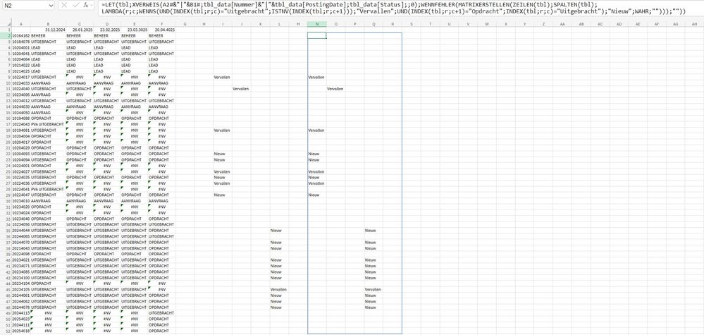 =LET( tbl, XLOOKUP(A2#&"|"&B1#,tbl_data[Nummer]&"|"&tbl_data[PostingDate],tbl_data[Status],,0), IFERROR( MAKEARRAY( ROWS(tbl),COLUMNS(tbl), LAMBDA(r,c, IFS( AND(INDEX(tbl,r,c)="Uitgebracht",ISNA(INDEX(tbl,r,c+1))), "Vervallen", AND(INDEX(tbl,r,c+1)="Opdracht",INDEX(tbl,r,c)="Uitgebracht"), "Nieuw", TRUE, ""))), "") )I'd apply LAMBDA with MAKEARRAY.