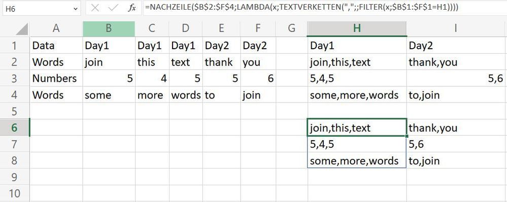 =LET( header, UNIQUE(D12#, 1), seq, SEQUENCE(ROWS(D13#)), REDUCE( header, seq, LAMBDA(a, v, LET( Day_1, TEXTJOIN(",", , FILTER(CHOOSEROWS(D13#, v), D12# = "Day1")), Day_2, TEXTJOIN(",", , FILTER(CHOOSEROWS(D13#, v), D12# = "Day2")), VSTACK(a, HSTACK(Day_1, Day_2)) ) ) ) )