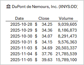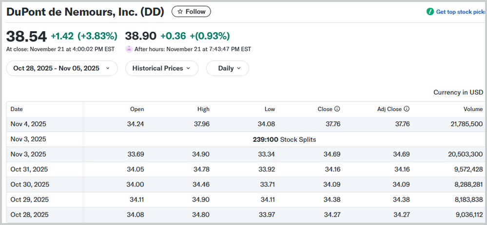 Excel’s STOCKHISTORY function is misleading investors by using Refinitiv’s unadjusted feed. On Nov 1, 2025, DuPont (DD) spun off Qnity Electronics, reducing DD’s price by a factor of 2.3912. Every brokerage and charting provider adjusted the prior history to maintain continuity, but Excel did not—producing a broken series that invalidates returns, volatility, and backtests. This isn’t a feature request, it’s a data integrity bug. STOCKHISTORY must default to the adjusted feed or at least provide an adjusted:=TRUE option. If you rely on Excel for analysis, please upvote this so Microsoft fixes it before more users are misled.
