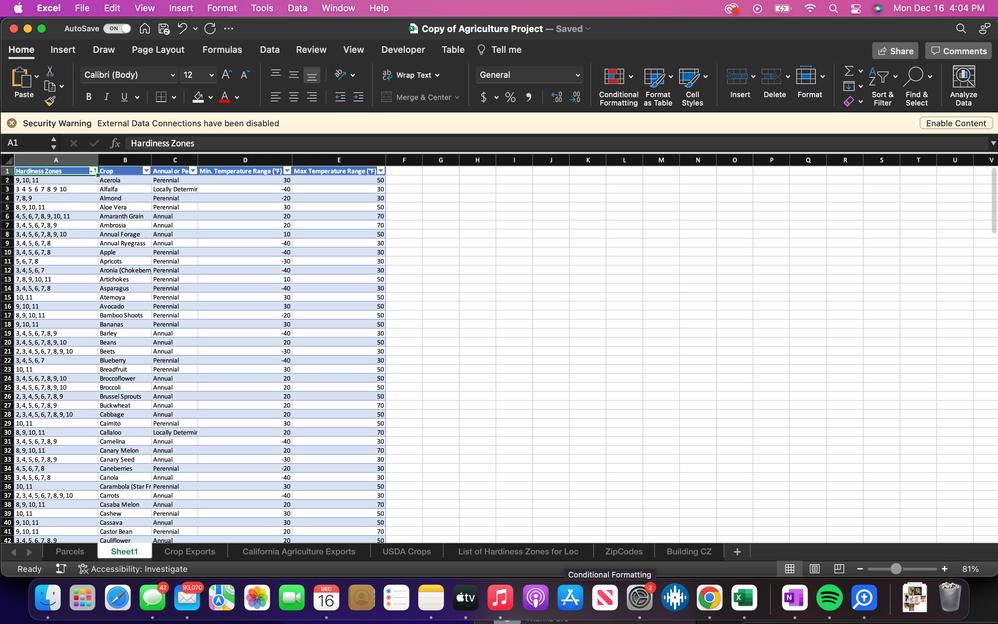 "Sheet 1" lists Hardiness Zone, Crop, Annual or Perennial, Min. Temperature Range, Max Temperature Range. My goal is to pull up all the crops that exist within the Hardiness Zones. (Ex. If searching Hardiness Zone 9, every Crop with the Hardiness Zone of 9 is pulled up.)