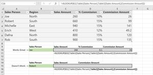 I'm using XLOOKUP (which is AWESOME, btw) to return multiple columns from a table. (See file for example). What I'd like to do is return Sales Amount and Commission Amount, which are non...