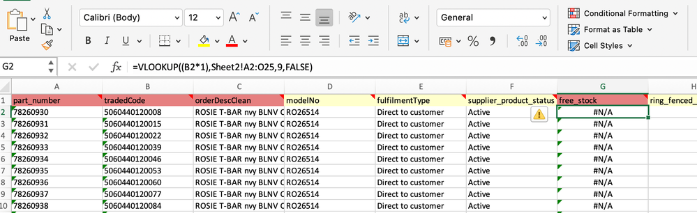 This is the formula I am using: =VLOOKUP(B2,Sheet2!A2:O25, 10, FALSE) as you can see from the screen shot I am getting a return value of #N/A
