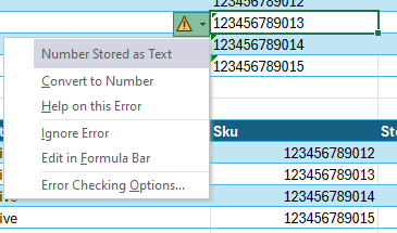 The common data is the second column (SKU). I am trying to use the data from the column Stock level.