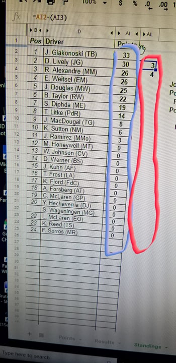 So I have AI2. I want the red column to represent the "points behind" of the numbers in column Blue from AI2. I could just go =AI2-AI3 and so on but that'd be time-consuming. Is there a formula to pull this off quickly? Thank you.
