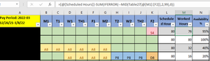 Calculating the M column for hours worked, I have a formula that will sum all amounts in cells in columns B:K with text to subtract them from the L column. Hours that remain are shown as hours worked...