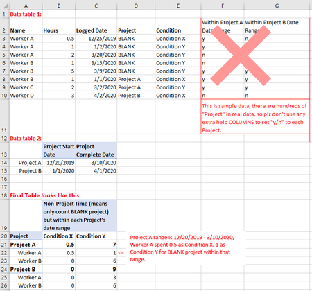 This sample data is simple, only has two project in it, so we can point to that specific cell to get that project's time range. But in real data. the Project are hundreds, and the name is like "Timesheet Sept", "Store In the East", random names. So the formula needs to somehow look for the project's start and end date based on its name; then use its start/end date to sum the hours that NOT linked to any project.