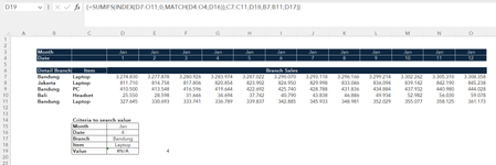 =SUM(MMULT(TRANSPOSE((A5:A9=C15)*(B5:B9=C16)),TRANSPOSE(MMULT((C1:N1=C13)*(C2:N2=C14),TRANSPOSE(C5:N9)))))This formula works in my sample file and in modern and legacy Excel. The formula must be entered as an arrayformula with ctrl+shift+enter if someone doesn't work with Office 365 or Excel for the web or Excel 2024.