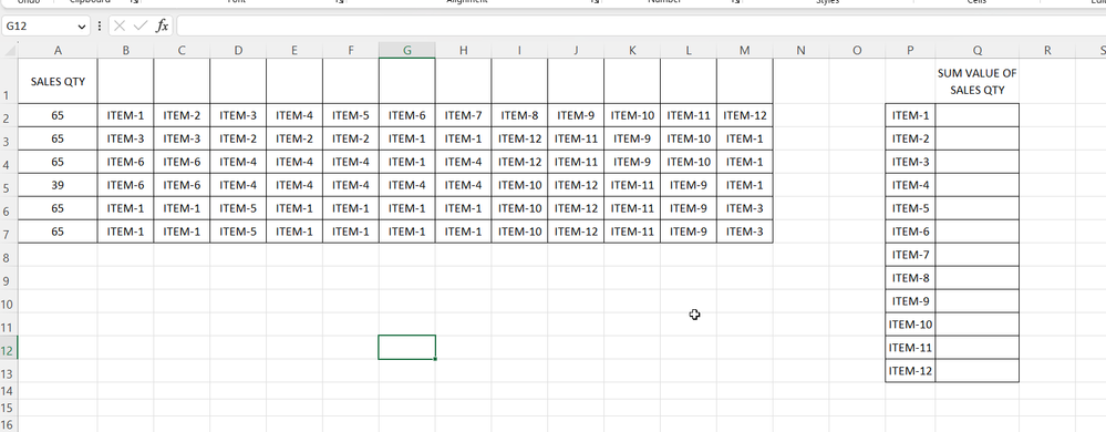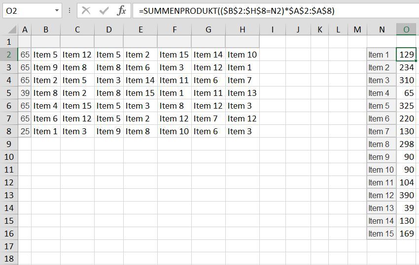 65 Item 1 Item2 Item3 Item4 Item5 Item6 Item7 65 Item3 Item3 Item2 Item2 Item4 Item4 Item5 Item 1 65 65 Item5 Item4 Item2 Item2 325 39 Item5 Item3 390 65 Item3 Item3 Item2 Item4 Item4 325 65 Item3 Item5 234 Item6 65 Item7 65 =SUMIF($B$2:$B$7,J3,$A$2:$A$7)+SUMIF($C$2:$C$7,J3,$A$2:$A$7)+SUMIF($D$2:$D$7,J3,$A$2:$A$7)+SUMIF($E$2:$E$7,J3,$A$2:$A$7)+SUMIF($F$2:$F$7,J3,$A$2:$A$7)+SUMIF($G$2:$G$7,J3,$A$2:$A$7)+SUMIF($H$2:$H$7,J3,$A$2:$A$7)