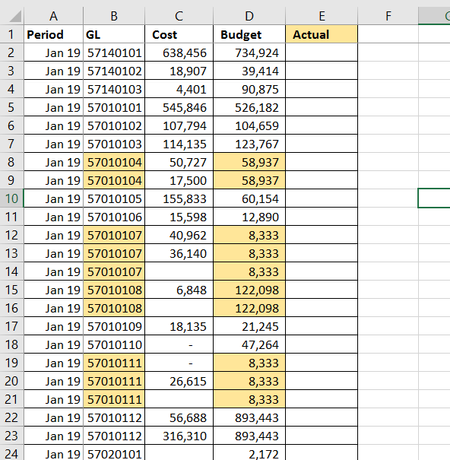I need column E to show only the first value of the budget for that GL (for that month) .. i.e GL 57010107 on row 12 should show 8,333 in column E .... E14 and E15 should show zero as the GL is a duplicate for Jan .. similarly costs relating to Feb should show 8,333 in E76 and zero values for E77 and E78 ..