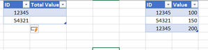 =SUMIF(Table2[ID], [@ID], Table2[Value])