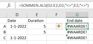 As visible on the picture above, I'm looking for a formula that allows the outcome in column G for A to be "6-1-21", for B to be empty, for C to be empty. Translation note: SOMMEN.ALS is SUMIFS...
