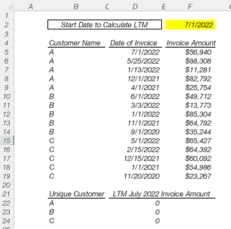 Sumifs for LTM Revenue over Unique Customers