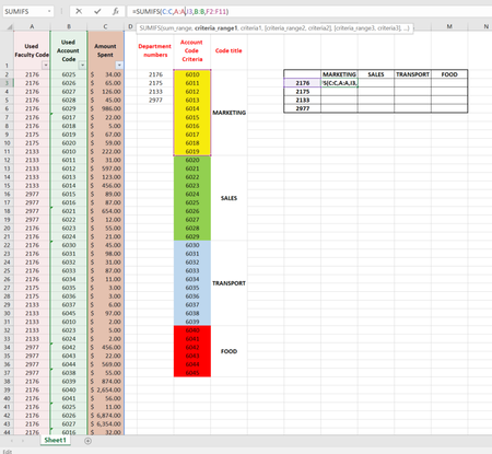 I have a multi-sheet budget spreadsheet at work. I am trying to total the spend for each department based on a selection of account codes.i.e: total spend of all "Marketing" codes...