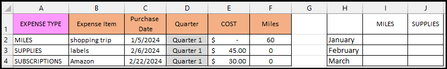 Hello! I am hoping to get help with formulas in Column I and J to summarize the data in the first section. Hoping to use SUMIF to add up the Miles and Supplies based on the date that is in Column C...