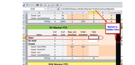 Formula in H7 calculates number of positions for the market in J6 with status as in G10. Calculation is made on columns C:C (Market), D:D (PositionNeeded) and F:F (Status).