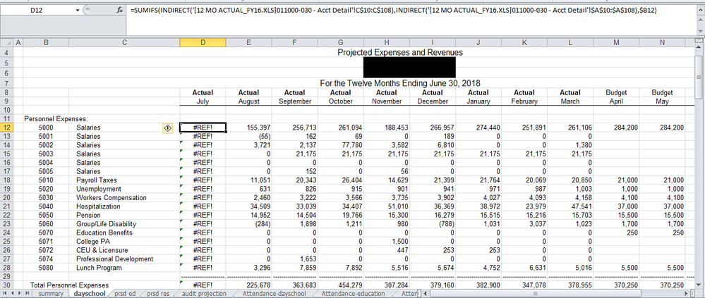 =SUMIFS(INDIRECT("'[12 MO ACTUAL_FY16.XLS]011000-030 - Acct Detail'!D$11:D$108"),INDIRECT("'[12 MO ACTUAL_FY16.XLS]011000-030 - Acct Detail'!$A$11:$A$108"),dayschool!$B12)- Antonio MorenoCopper Contributor