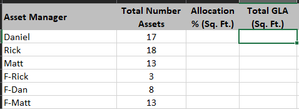 Hi all, I am trying to sum a certain value based on certain criteria between different sheets. In the below picture, I would like to sum the Total GLA based on the Asset Manager. ...