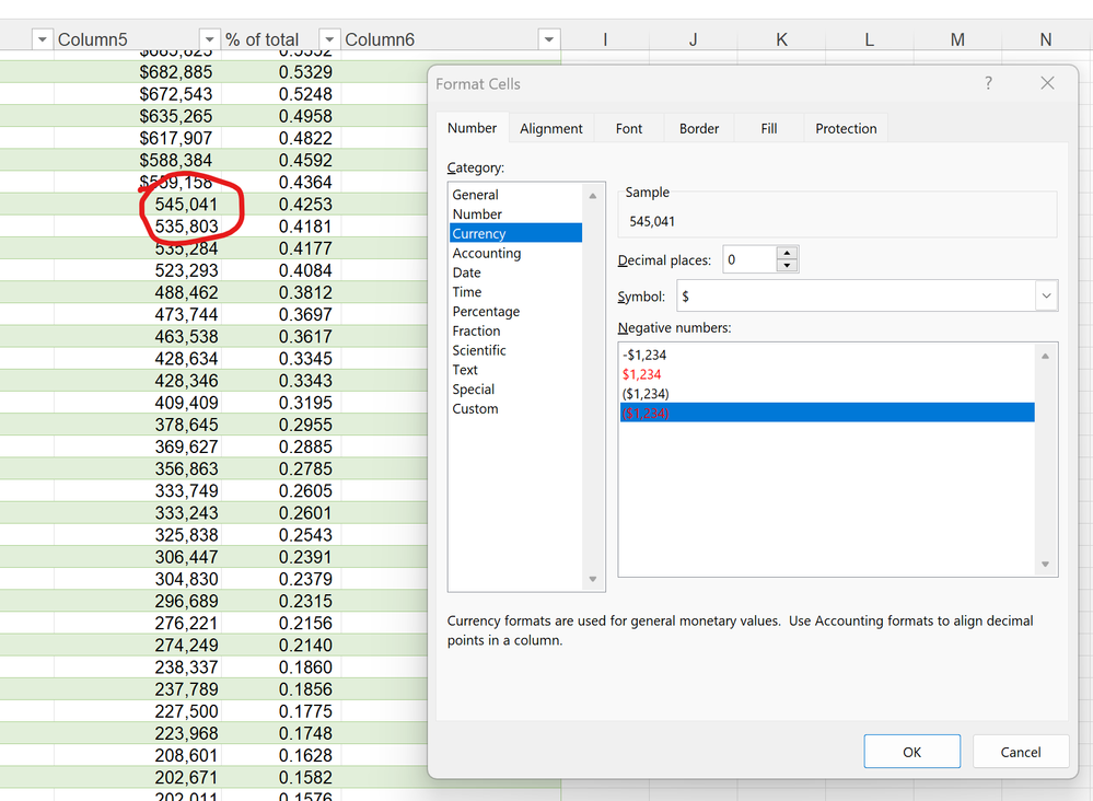 P.S. In image below, the number 545,041 is already in the currency format...yet it is not showing as currency. The numbers above it have been manually manipulated by changing the value, then changing it back to the original number--which allowed me to change the format. I have tried restarting Excel but it did not fix the issue; have also tried copying numbers to another place w/o formatting, etc. but same problem persists.