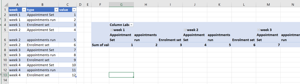 Now you can build a pivot table where your data is grouped by week and type.