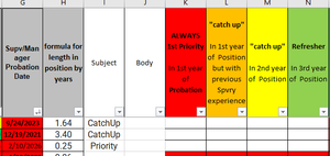 With this I was able to identify my newest supervisors still on probation in column G; I used this conditional formatting rule =G2>=TODAY() to highlight them red. As you see I have some source data issues to address.