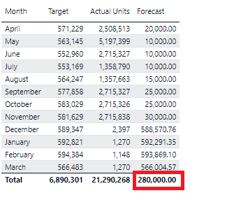 Forecast = IF ( HASONEVALUE ( 'Calendar_'[Month] ), CALCULATE ( SUMX ( VALUES ( Points[DBName-Point_Id] ), [Pre_Forecast] ) ), SUMX ( VALUES ( 'Calendar_'[Month] ), CALCULATE ( SUMX ( VALUES ( Points[DBName-Point_Id] ), [Pre_Forecast] ) ) ) )don't use VAR in above, most probably will be incorrect result.