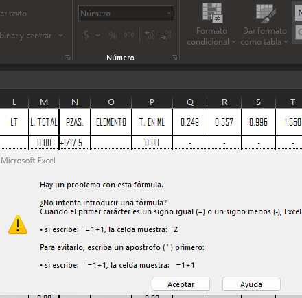 Hi, I'm trying to write this formula +1/17.5, when the cell is in "general" format, there's no problem, but when the format is "number" an error pops saying "There is a problem with this formula"...