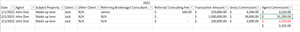 I ask because there are so many different ways to look at this, and your sample sheet carries the heading "Closing Record 2022" implying that it's meant to be a year-end calculation. In which case, one could do one calculation very easily on ALL the sales due to John Doe, rather than a line by line calculation as you're currently trying to do.