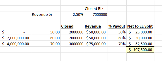 The problem is we want to create a tiered schedule where the split changes as the closed business increases.