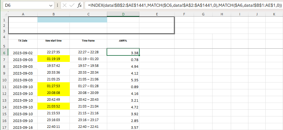 But the formula (index and match) sometimes gives me N/A. Mostly when the time frame has 01 in hours, or 03, 08 in minutes.