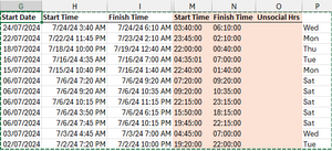 Regarding your "Unsocial Hours" calculation, assuming a shift is never more than 18 hours long, you could try the following formula in cell O2 and copy it down: