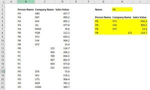 Personally, I would use a Pivot Table to show your Dashboard info. If you place your data in a table, add a column to duplicate the name (since it is in a table, Excel will use it as a column formula, and automatically apply it to each new row), and reference that table for your Pivot Table, set the Filters as the person name, the Rows as Name (the duplicated one) and Company, and Values as the Sales Value, it will give you what you want, with the exception of the person name on each row. If you do it this way, the dashboard is dynamic. It will expand or shrink based on the number of entries, and if you have multiple entries for one person and the same company, it will automatically add them together. Give this example a look, and see if it will work for you.