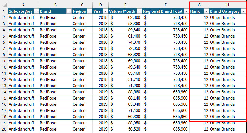 In addition to this, there was another approach that I did try, and that was to create some helper columns G and H (Rank and Brand Category).