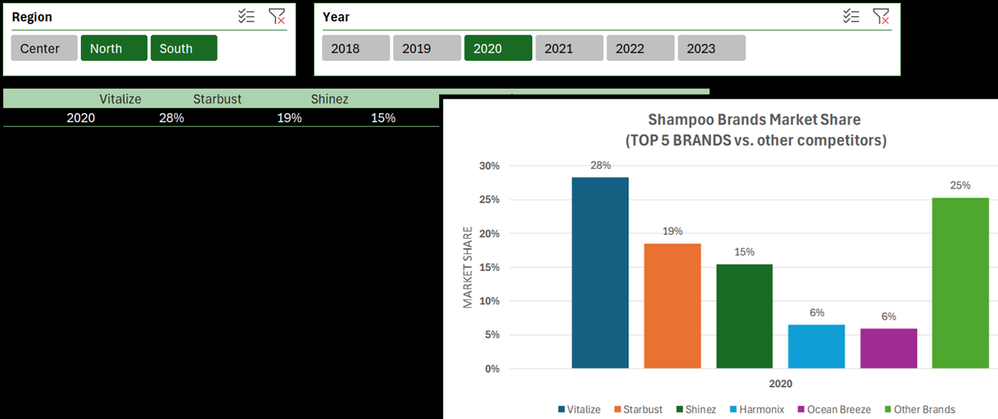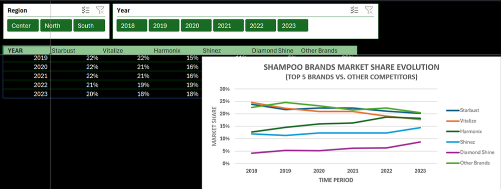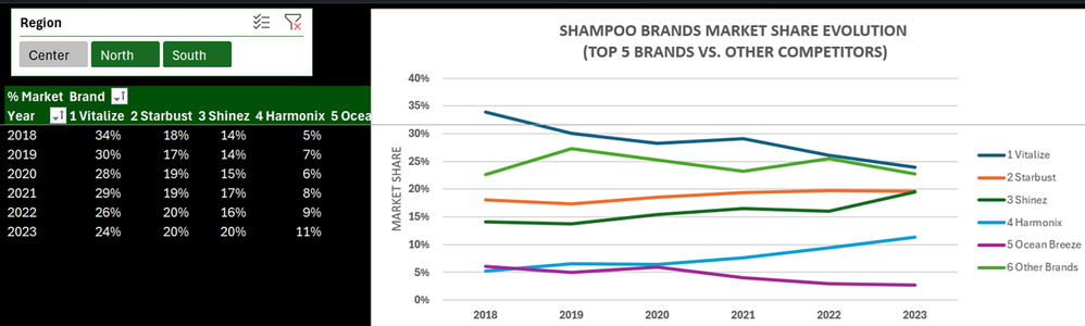 The goal here is to just show how the brands market share evolved over a period of time (years) per region/all regions (slicer) and/or subcategory/all subcategory (slicer).