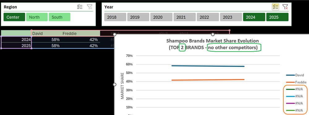 // TOPN_BRANDS_REPORT =LAMBDA([top_n], LET( TOPN_Value, IF( ISOMITTED( top_n ), TOPN_Default, top_n ), pivotedBrands, PIVOTBY( TableSource[Year], TableSource[Brand], TableSource[Values Month], PERCENTOF, 0, 0, 1, 0, -2, TableSource[NOT_Filtered], 1 ), IF( COLUMNS( pivotedBrands ) -1 >= TOPN_Value, LET( arrTopn, CHOOSECOLS( pivotedBrands, SEQUENCE(, TOPN_Value, 2 ) ), TopnValues, DROP( arrTopn, 1 ), OtherValues, BYROW( TopnValues, LAMBDA(rw, 1 - SUM( rw ) ) ), GroupedBrands, VSTACK( HSTACK( TAKE( arrTopn, 1 ), GROUPED_BrandsName ), HSTACK( TopnValues, OtherValues ) ), HSTACK( TAKE( pivotedBrands,, 1 ), GroupedBrands ) ), pivotedBrands ) ) )Remains the challenge of the Chart I couldn't make fully dynamic (cf. Chart from dynamic array challenge | Microsoft Community Hub), hence the 'CHART' helper sheet in the workbook. If by any chance someone finds a solution to this issue I'll let you know...