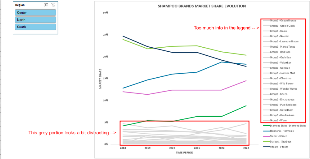 which is true. The years was only for the chart to show a time period, not to filter or slice. Therefore, I just wanted to filter/slice by Region and maybe Subcategory so that we could see the market share trend over time for a specific subcategory/all subcategories across a specific region/all regions.