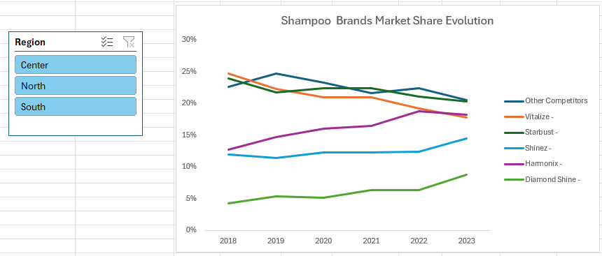 I'm seeking some help because I'm kind of new to the more intermediate stuff in Excel. I have an Excel table with the following columns: Subcategory in column A, Brand in column B, Region in column C, Year in column D and Values Month in column E. I want to create a PivotTable and a Pivot line chart from this PivotTable that ranks the Top 5 Brands vs. Other Competitors by each region. For added context: There are 5 subcategories, 3 regions and 25 brands.