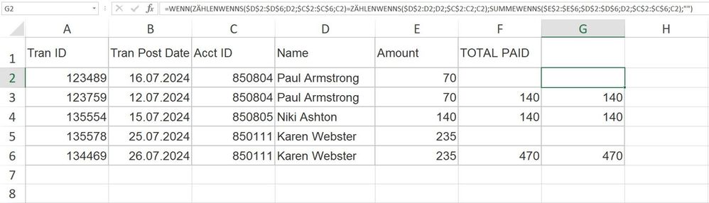I have a spreadsheet with different names/account numbers and each line has a payment amount. How do I total only the amounts with the same names/account ID without having to manually Sum the payment amount. What is the formula to total payment amounts IF the name/acct# is identical? I would like a new column to have the total. I need a total for each customer even if there are not multiple payments The only data that I do not have is the TOTAL PAID column which is what I am looking to create.