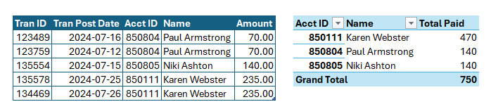 | Tran ID | Tran Post Date | Acct ID | Name | Amount | TOTAL PAID |