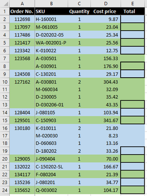 =IF(A2=A3,"",SUMIF($A$2:A2,A2,$D$2:D2))If you complete the data in column A "Order No." as shown in the screenshot you can try this formula.