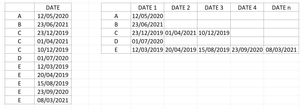 Essentially I start from a table like the one on the left, 2 columns, one for names and one for dates and I want a "result table" like the one on the left.