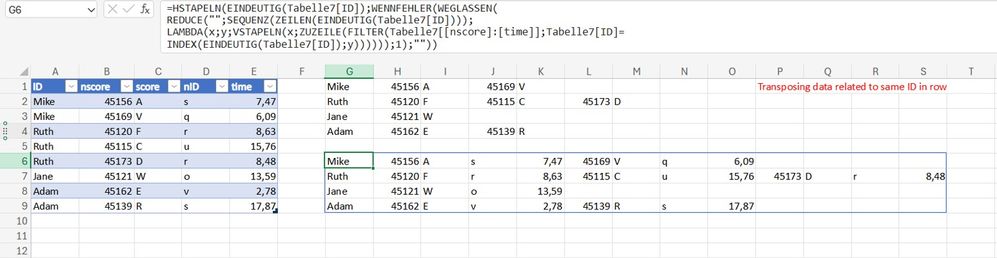 LAMBDA(x,y,VSTACK(x,TOROW(FILTER(Tabelle7[[nscore]:[time]],Tabelle7[ID]=