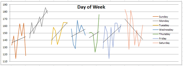 I have data sorted by day of week (then date) and placed in a chart. I would like to be able to add a separate trendline for each day. This application could be extended to other, stratified data, such as machine turrets by day of week, operator, age of tool, time since maintenance, etc.
