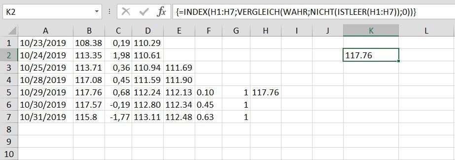 =INDEX(H1:H7,MATCH(TRUE,NOT(ISBLANK(H1:H7)),0))You can try this formula. Enter the formula with ctrl+shift+enter if you don't work with Office 365 or Excel 2021.