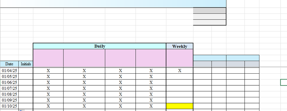 I have a excel sheet that lists tasks as Daily, Weekly, and Monthly. I want a cell to turn yellow if it hasn't been checked off, "X", within the past 7 entries. I want the cell to change after the person has entered their initials and put "X" in all the daily tasks, to remind them to perform the weekly task. Any help would be appreciated.