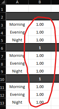 Your long formula results from your (bad) data structure (possibly a crosstab; blank rows).