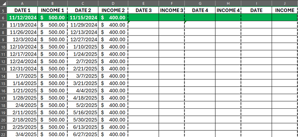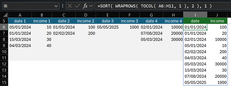 So I have data in 8 different columns. 4 of those columns will have dates in them and as you can see from the image, the dates won't exactly match most of the time. So, I'm trying to get ALL of the data (dates and amounts) to be sorted in chronological order in columns I/J. Also, not all the columns will have data in it all the time, data starts on row 6 and can go up to row 600. Can this be done using a formula? Not sure if there's a macro out there that will do this