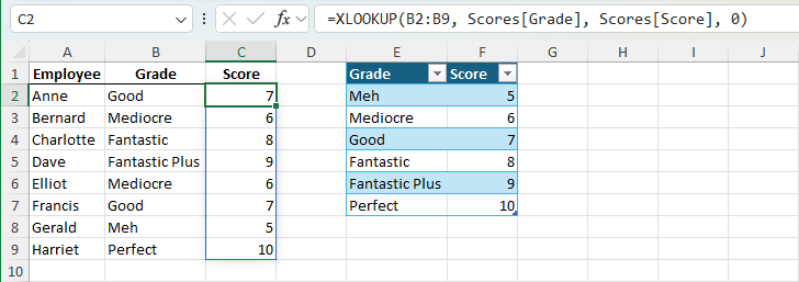 =XLOOKUP(B2:B9, Scores[Grade], Scores[Score], 0)