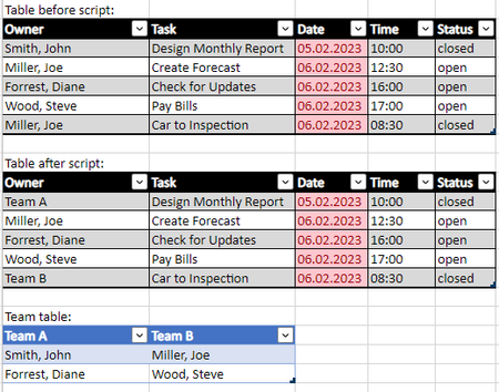 function main(workbook: ExcelScript.Workbook) { const tasksTableName = "Tasks" //replace for your tasks table name const teamsTableName = "Teams" //replace for your teams table name const tasksTable = workbook.getTable(tasksTableName)//.getRangeBetweenHeaderAndTotal() const teamsTable = workbook.getTable(teamsTableName) for (let i = 0; i < tasksTable.getRangeBetweenHeaderAndTotal().getValues().length; i++){ if(tasksTable.getColumnByName('Status').getRangeBetweenHeaderAndTotal().getRow(i).getValue() === "closed"){ const currentOwner = tasksTable.getColumnByName('Owner').getRangeBetweenHeaderAndTotal().getRow(i).getValue() let teamName:String = null teamsTable.getColumns().map(col => { const usersInTeam = Array.from(col.getRangeBetweenHeaderAndTotal().getValues()) if (usersInTeam.flat().includes(currentOwner)){ teamName = col.getName() } }) if (teamName !== null){ tasksTable.getColumnByName('Owner').getRangeBetweenHeaderAndTotal().getRow(i).setValue(teamName) } } } }Note that: